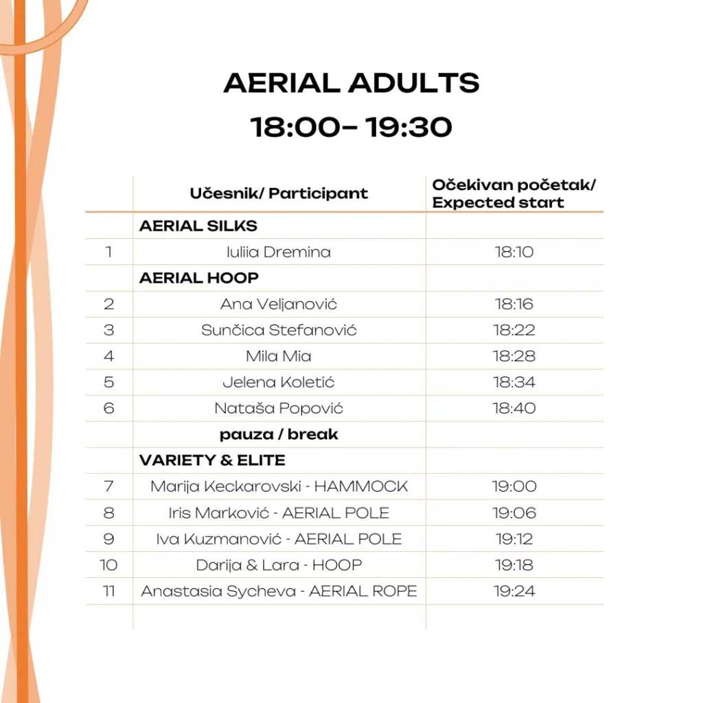 Koreografije na svili, obruču, hammocku, letećoj šipci i konopcu, prezentovane od strane i juniora i seniora, i amatera i profesionalnih akrobata, podeljene su na 2 dela programa. Redosled nastupa se obično pravi na osnovu nivoa i kategorije, s tim što smo za ovaj dan učesnike podelili i u starosne kategorije. Sledi raspored događaja kako je objavljen za 21.04.2024. godine: