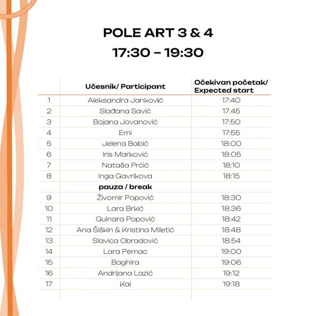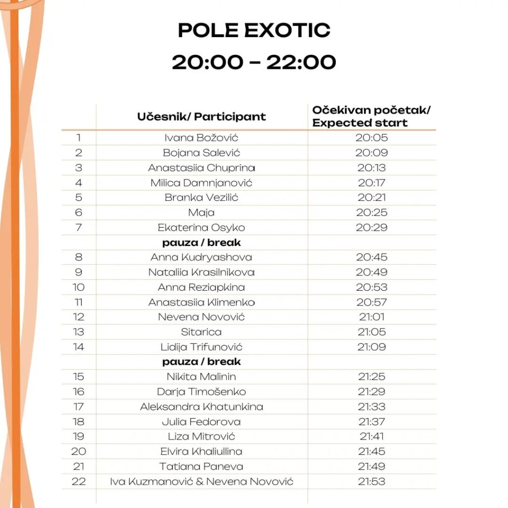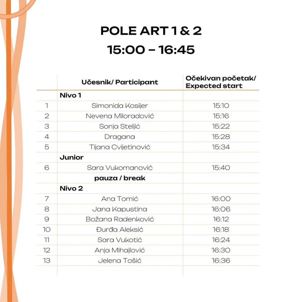 Na naš, Pole & Aerial praznik, slavi se dan svih onih koji su pronašli slobodu i svoj umetnički izraz u plesu na šipci, koji nisu ostavili igru za detinjstvo, već nastavili da žive život s obe noge čvrsto – van zemlje. Sledi raspored događaja kako se odigrao 28.04.2024. godine: