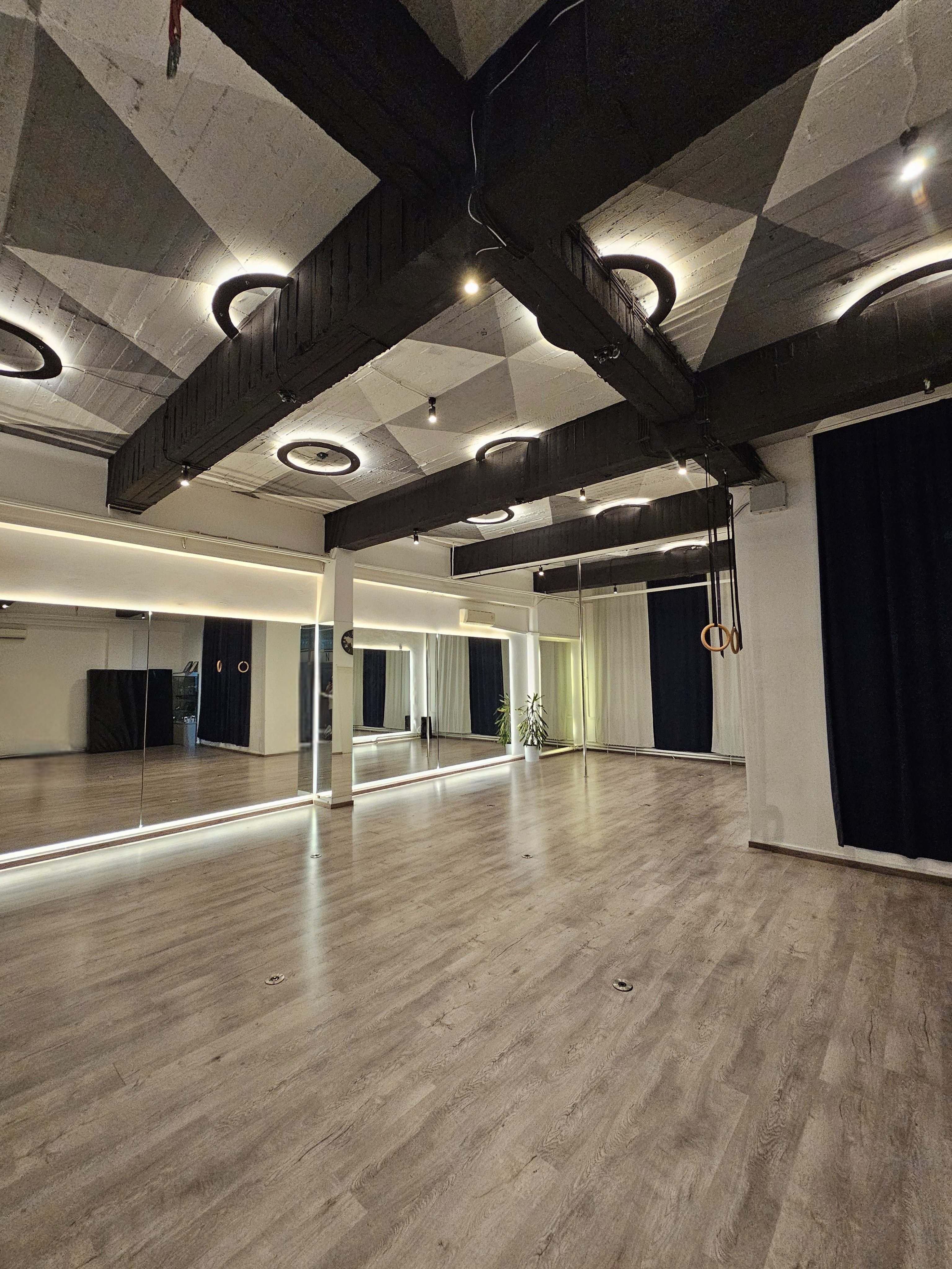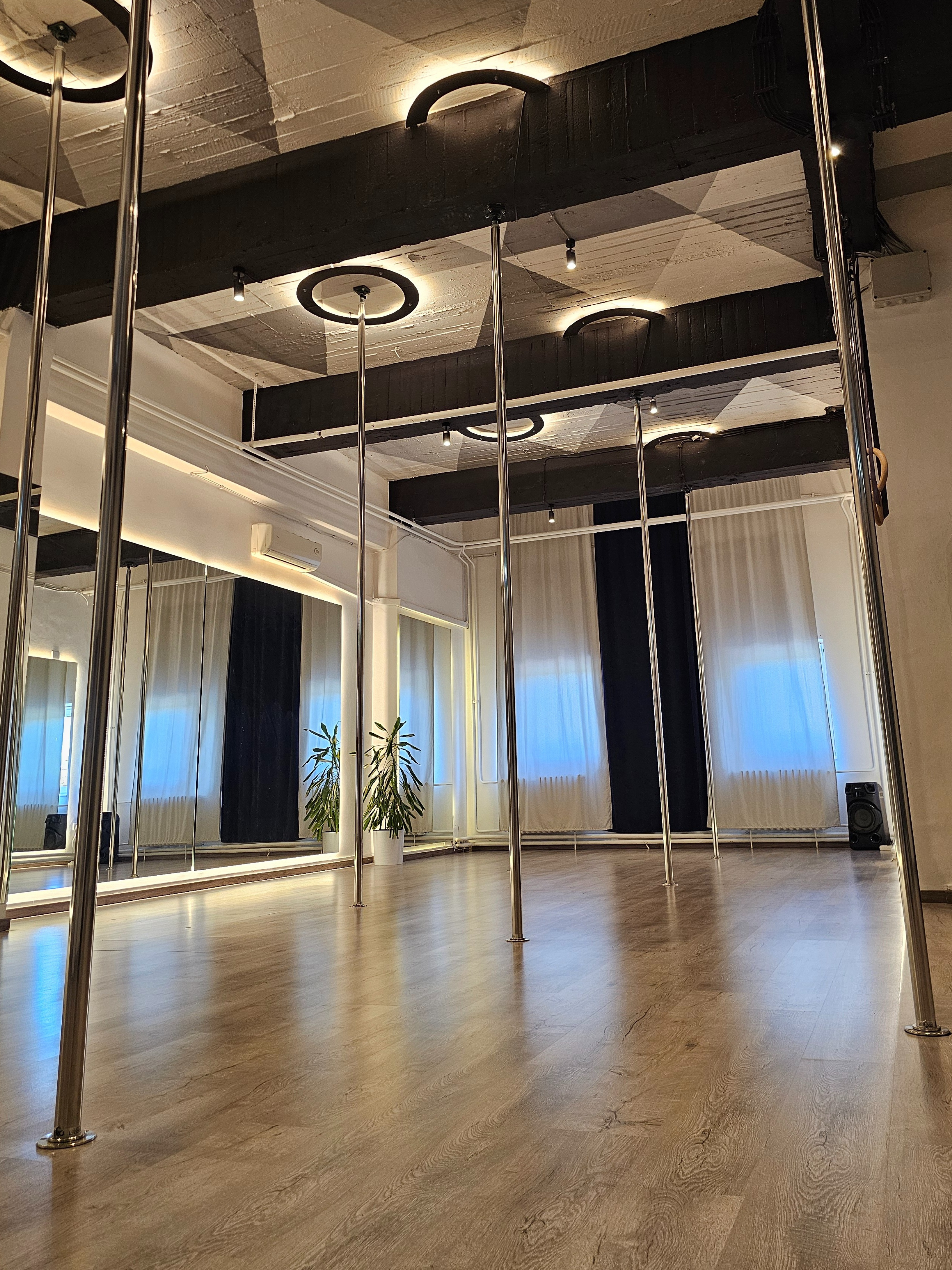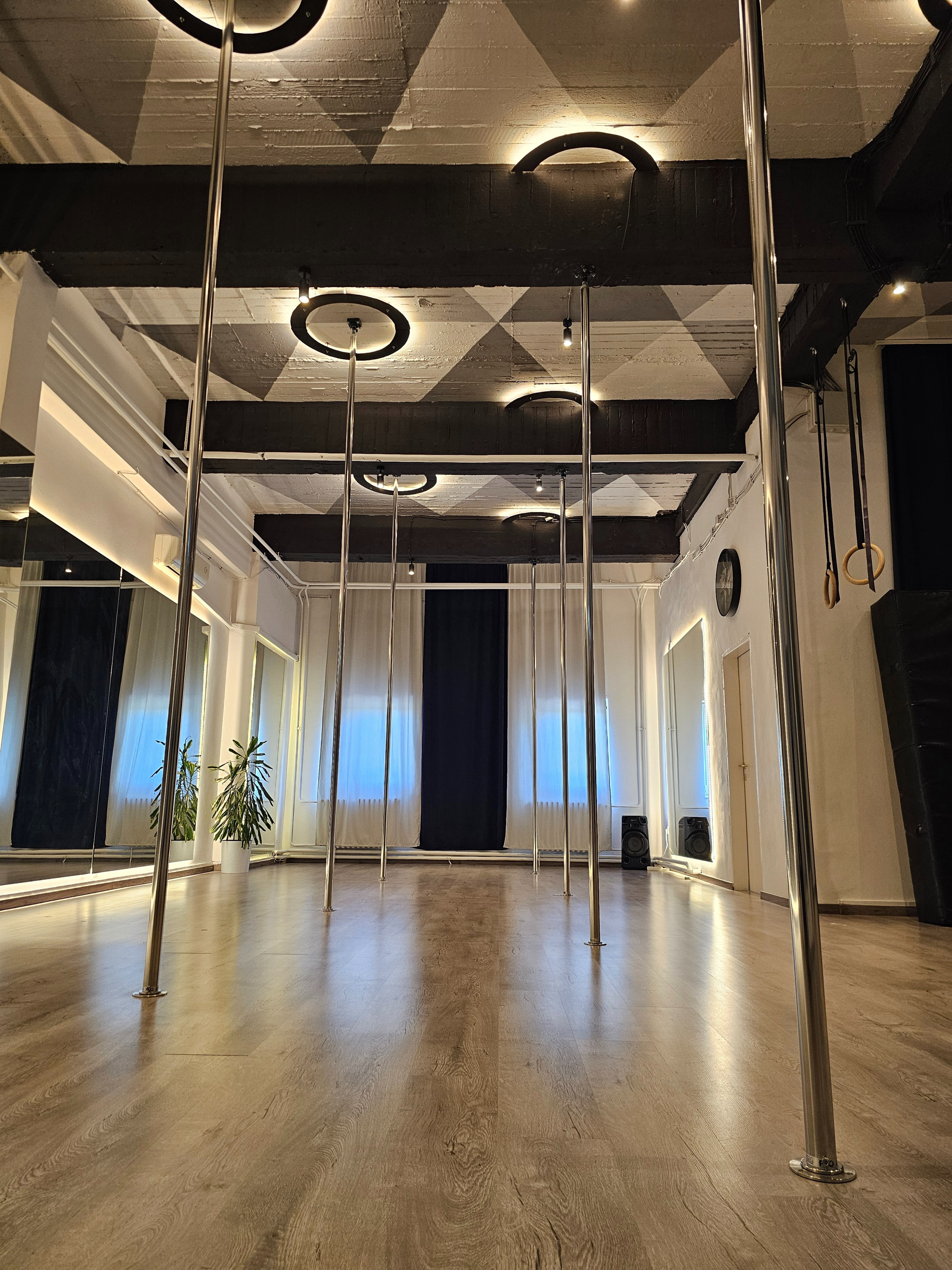 Dobrodošli ste na preko 100m2 opremljenog prostora, sa 9 šipki (pole4you), 4 obruča (House of Mokosh), 4 svile (Pole Sports), Letećom šipkom (Lupit), pole & aerial doskočnicama (Lupit), mini teretanom, odvojenom svlačionicom, besplatnim wifi i – kuvalom za kafu!